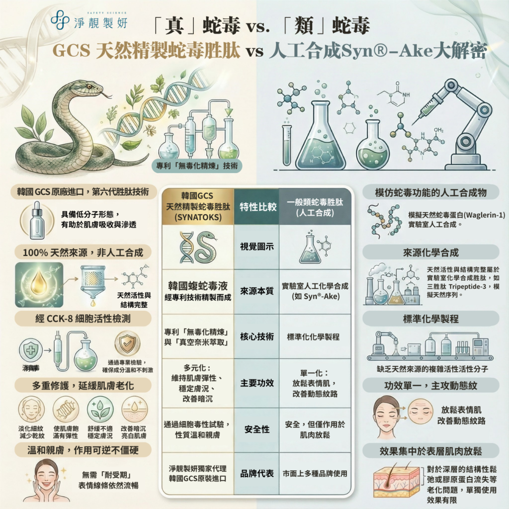 不同於化學合成,SYNATOKS 是由韓國蛇毒液透過專利「無毒化精煉」與「真空奈米萃取」技術而成。這確保了成分的活性與結構完整,能提供比合成胜肽更精準的生物信號傳遞。