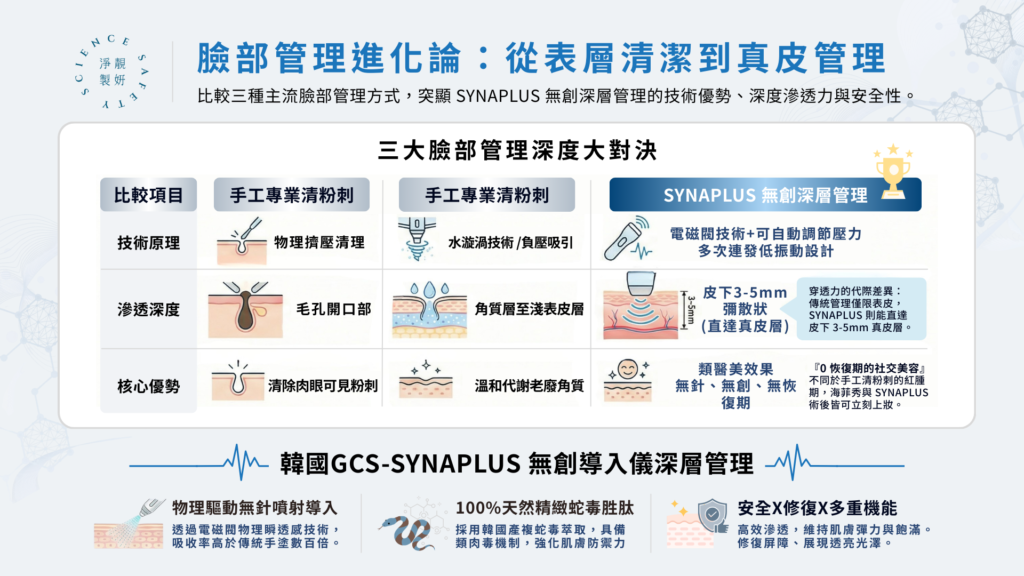 在非侵入式臉部管理的領域中,消費者常在「舒適度」與「有效深度」之間掙扎。傳統美容多停留在表層,而醫美注射雖深卻伴隨風險。在追求細緻肌膚的過程中,「修復期」與「吸收效率」是消費者最在意的兩大核心。隨著科技進步,現代美容管理已從單純的表層清潔,進化到利用高階物理技術提升精華吸收。本文將針對三種熱門臉部管理進行深度對比,並解析來自韓國 GCS 的 SYNAPLUS 無創物理導入技術 如何解決保養品吸收的瓶頸。